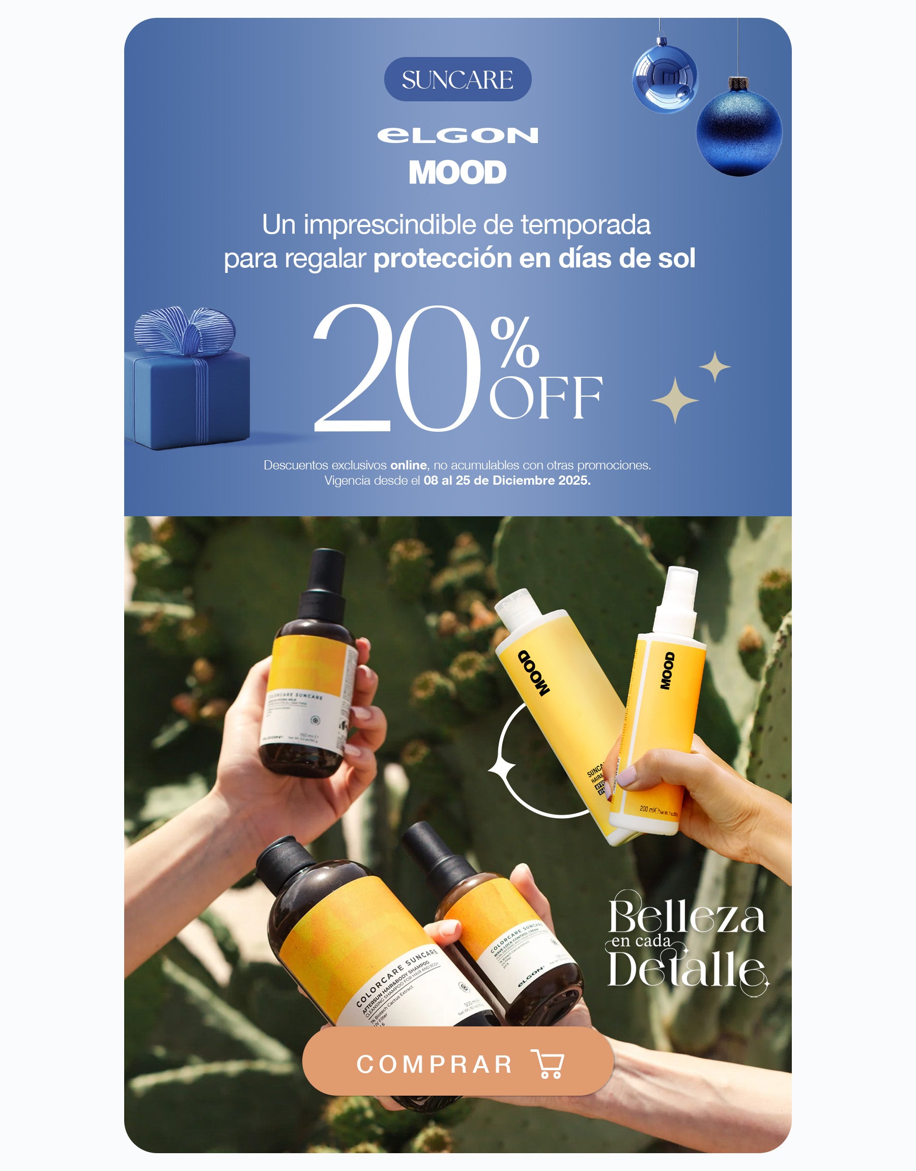 La línea Colorcare Suncare de Elgon está diseñada para proteger tu cabello y tu piel durante y después de la exposición al sol. Cada fórmula combina ingredientes nutritivos y extractos naturales que ayudan a mantener el color vibrante, la hidratación y la suavidad, incluso en los días más intensos de verano.